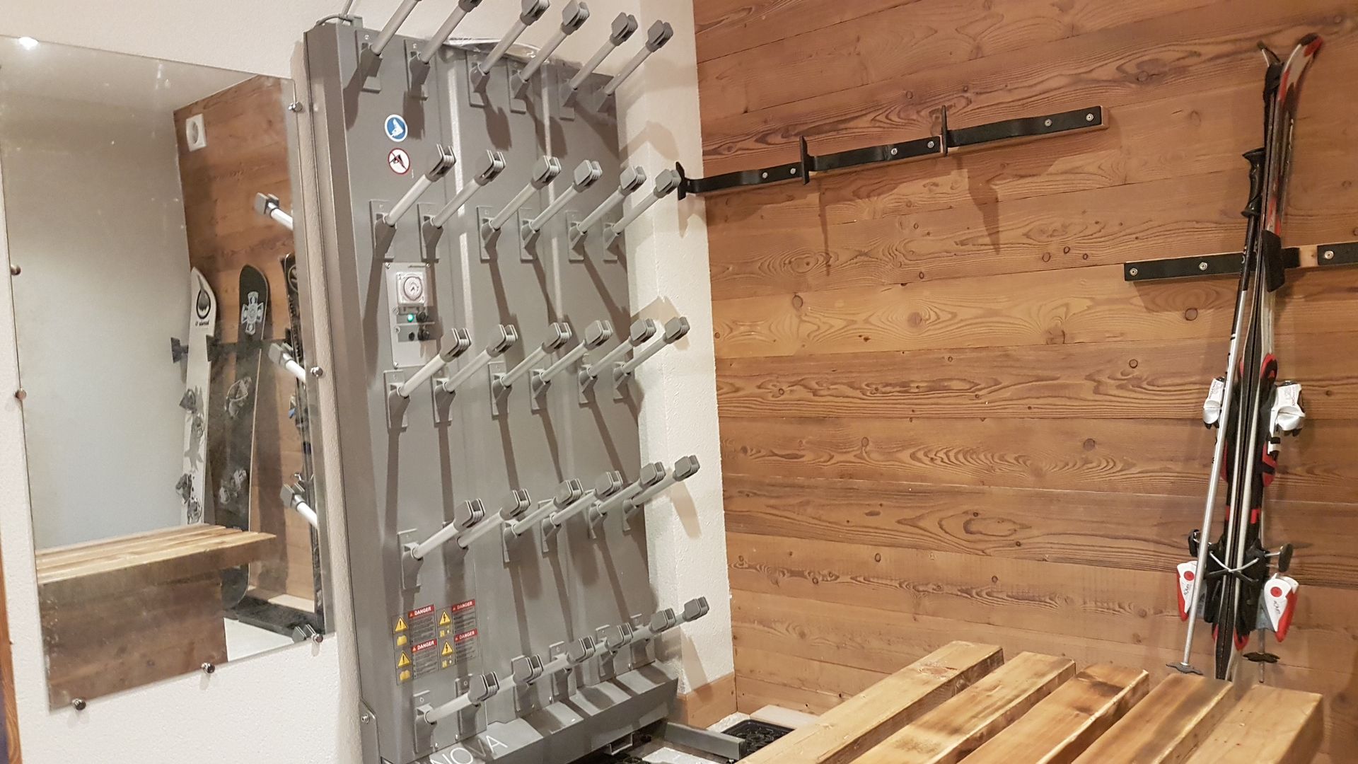 Un ski room commun (uniquement en hiver) de 12m² au rez de chaussée avec sèche chaussures, rack de skis, rangements divers, penderie, atelier ski.