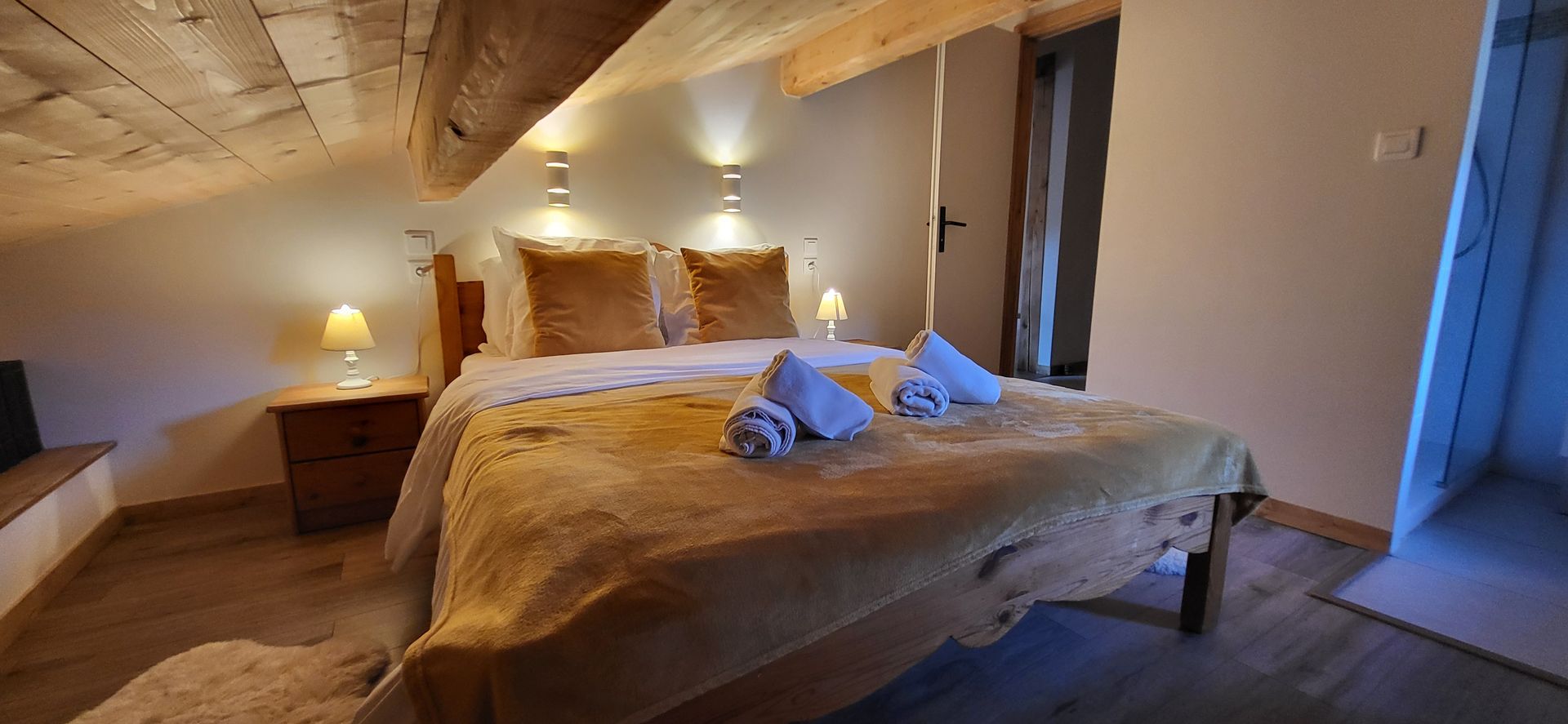 Sa surface totale de 127 m² (dont 27m² inf à 1.80m), peut loger confortablement 8 personnes, 10 sous certaines conditions. Situé au premier étage de notre chalet (entrée indépendante) sous le plafond mansardé avec poutres apparentes...